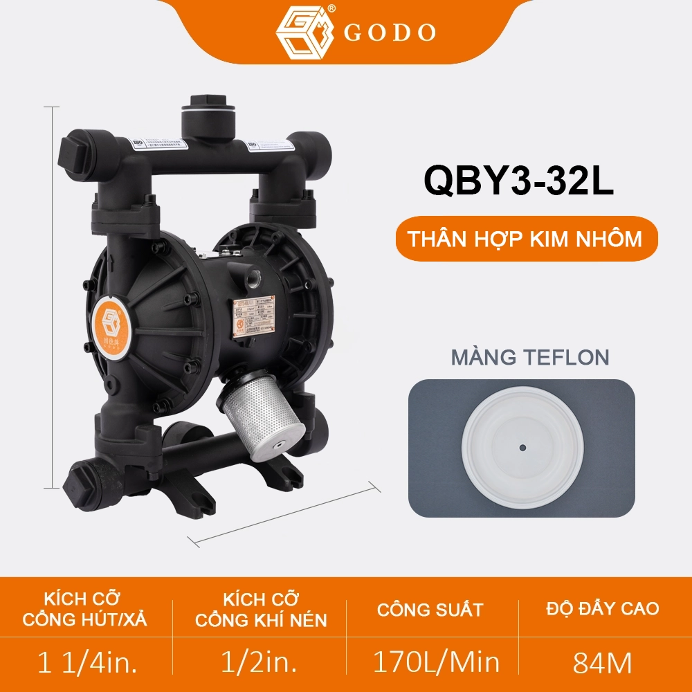Máy bơm màng khí nén GODO QBY3-32 hợp kím nhôm là dòng bơm công nghiệp cao cấp do tập đoàn Bianfeng (Trung Quốc) sản xuất – thương hiệu nổi tiếng trong lĩnh vực thiết bị bơm khí nén.